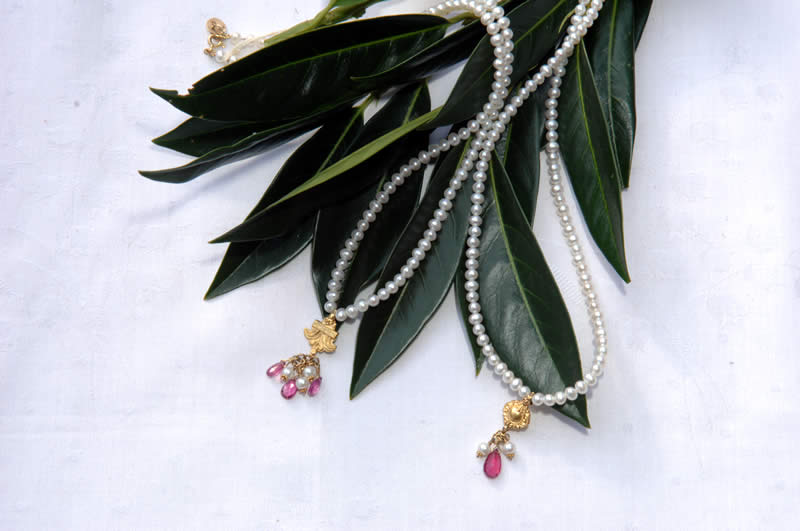 18 karat Gold chain with Rubies, Akoya Pearls, Iolite droplets and Gold pieces